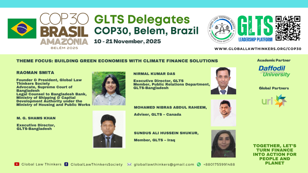 The Global Law Thinkers Society (GLTS) is proud to announce its official delegation to the United Nations Climate Change Conference (COP30) to be held in Belém, Brazil in 2025.