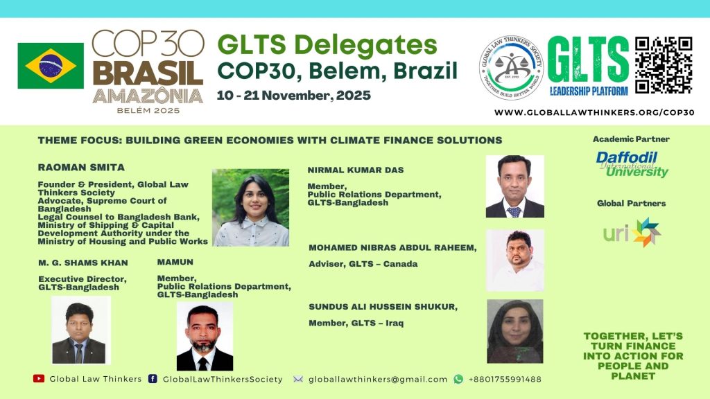 The Global Law Thinkers Society (GLTS) is proud to announce its official delegation to the United Nations Climate Change Conference (COP30) to be held in Belém, Brazil in 2025.